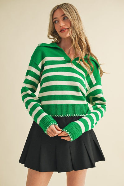 Kelly Green Striped Collared Sweater