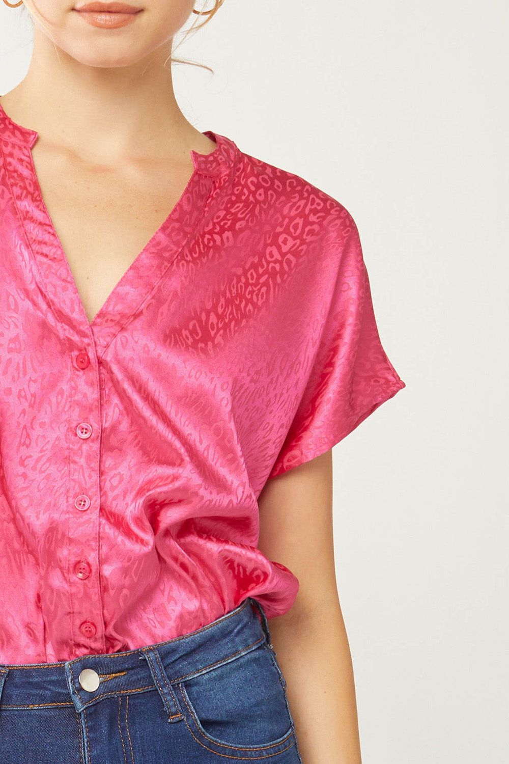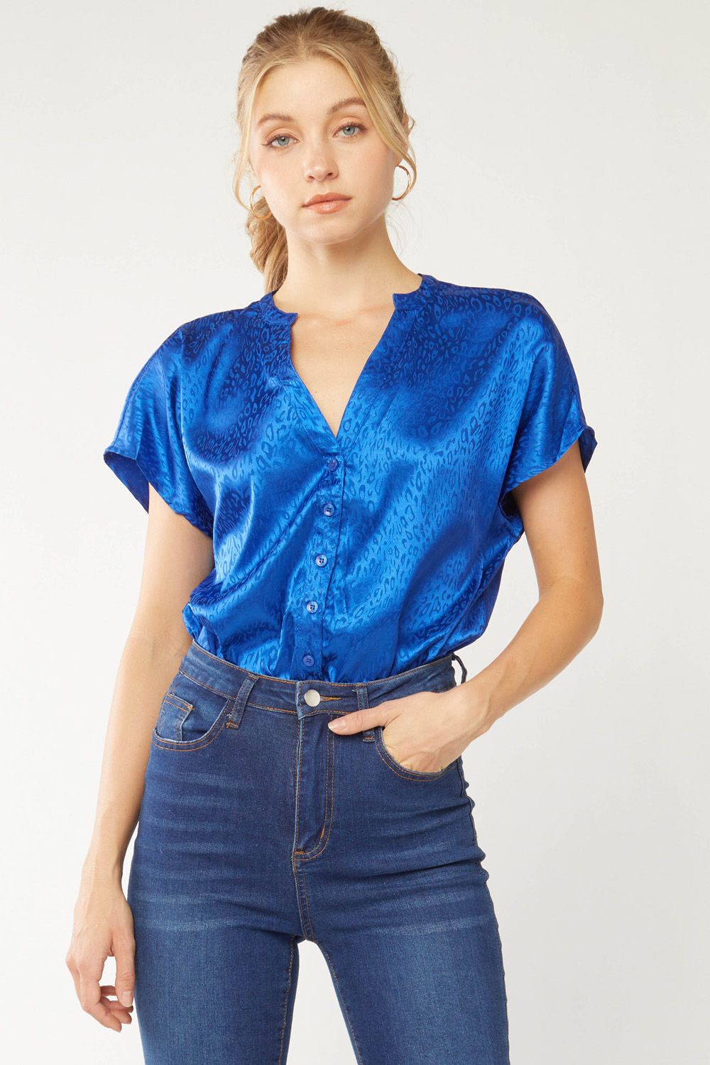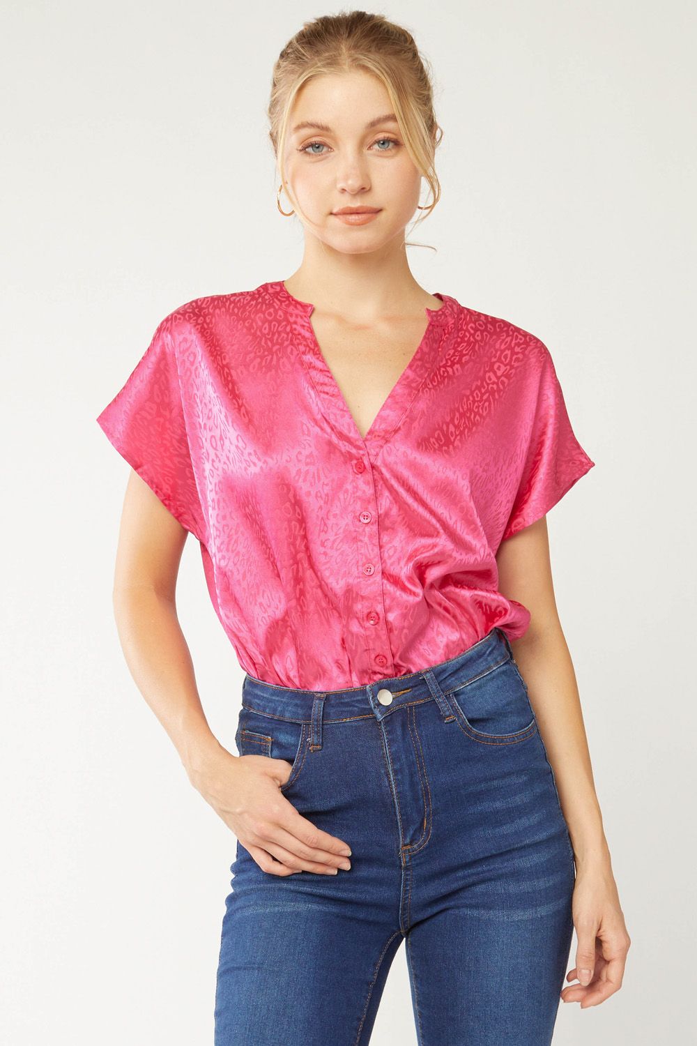 Unleash your wild side with the Brina Cheetah Bodysuit. Made with a satin leopard print fabric, this v-neck short sleeve bodysuit features a snap button closure for easy wear. The lightweight, non-sheer material offers comfort and style for any occasion. Go ahead, pounce on this trendy piece!