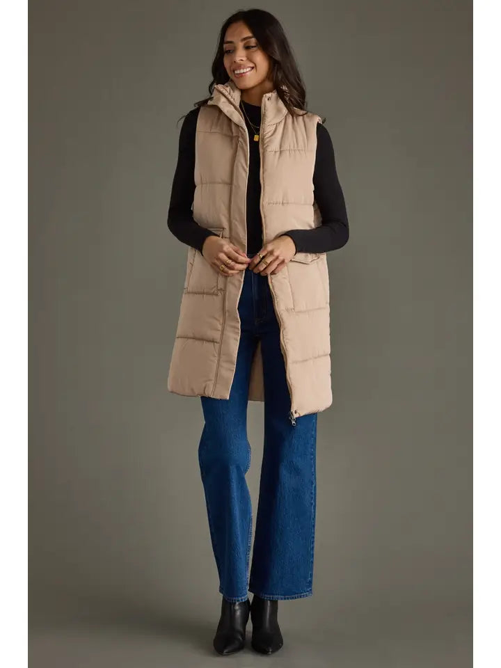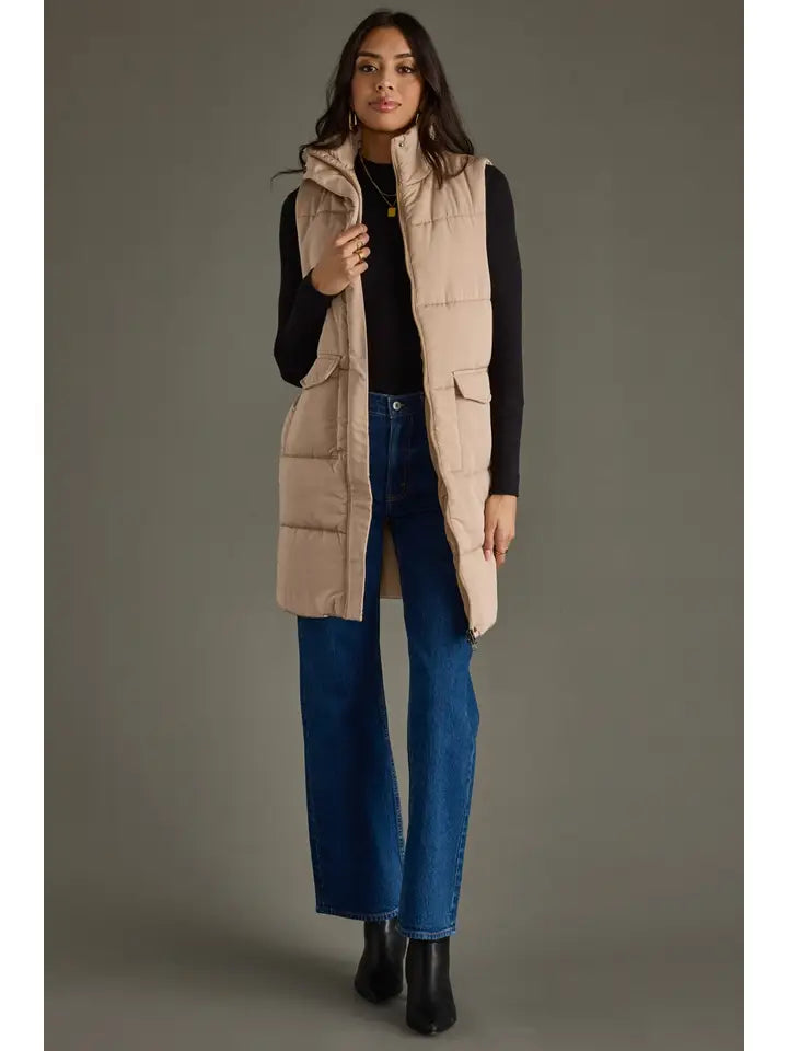This tan long vest is your new go-to for layering with a twist. Featuring a handy zipper and snap closure up front, it keeps you cozy and secure all day long.