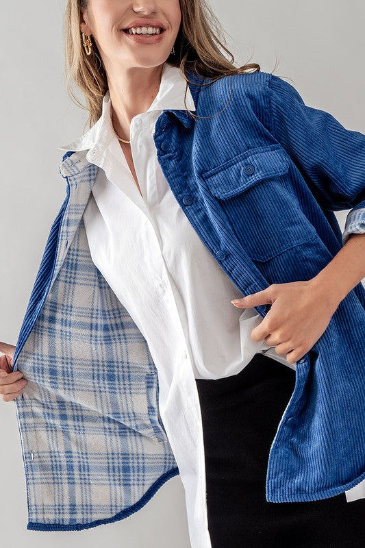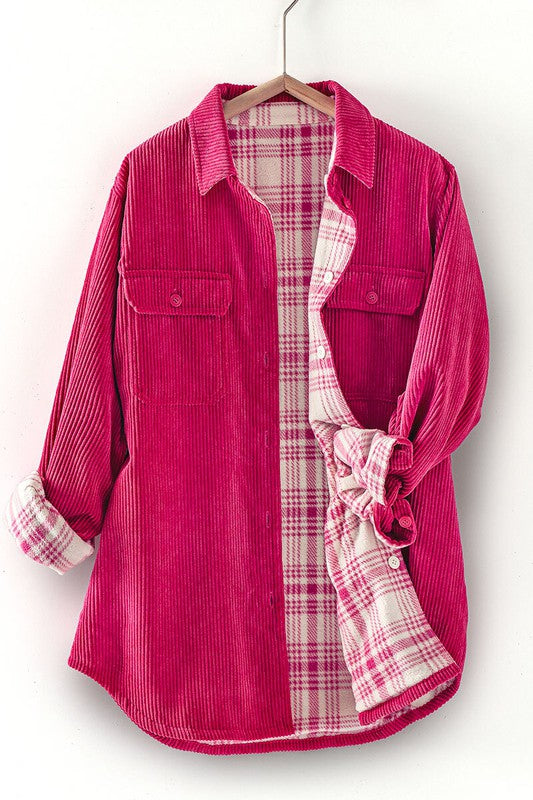 Add a pop of color to your wardrobe with this reversible shacket! Perfect for any season, the unique corduroy fabric, button down style, and striking hues make for a stylish statement piece that will turn heads!