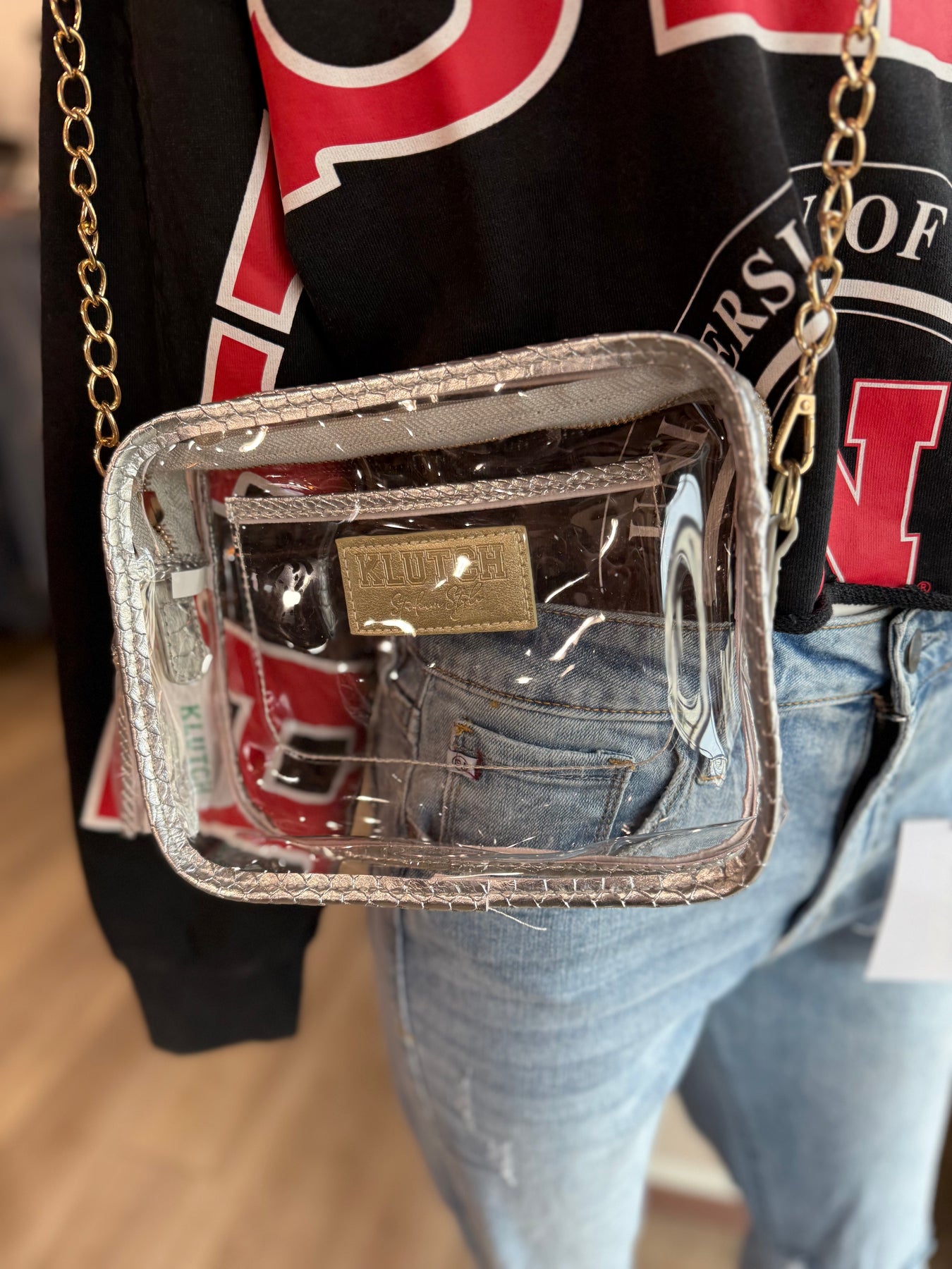 Caring for you bag: Clear Vinyl is easy to maintain using lens wipes or a soft cloth and ammonia-free glass cleaning agent. For best results, wipe the bag both inside and out and allow 30 minutes dry time before carrying your 'K'lear Klutch!