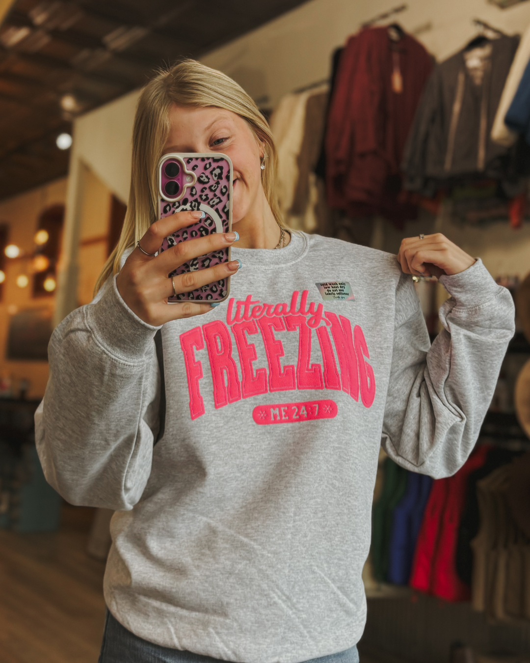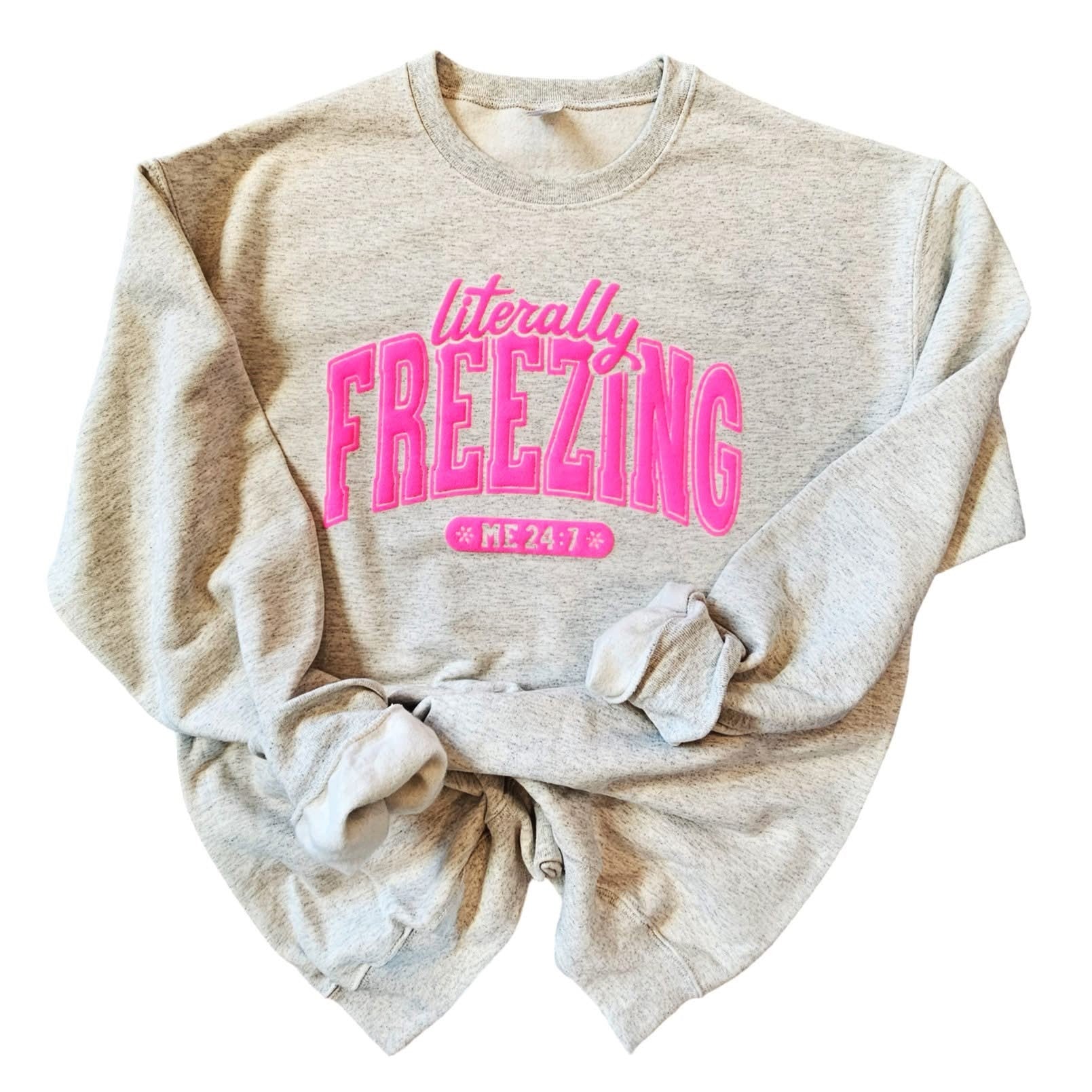 Bundle up in this cozy crewneck sweatshirt that's perfect for those brutally cold winter days when you're literally freezing. Soft, comfortable, and unapologetically warm, it's your go-to layer for staying toasty while braving the chill.