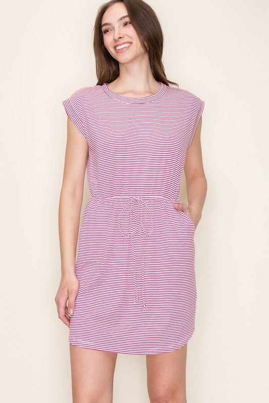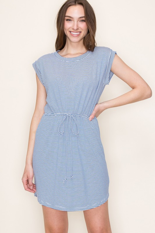 Get ready to strut in this pinstriped jersey dress with a hint of quirkiness. With a round neck, cap sleeves, and a drawstring waist, this dress provides a flattering fit while keeping it playful. Dress this up or down!