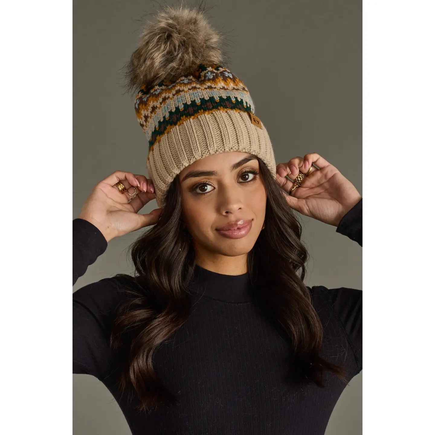 Stay cozy and cute with this charming pom hat featuring a playful mix of taupe, mustard, brown, green, and light blue patterns. Lined with soft fleece to keep you warm, it's topped with a fluffy faux fur pom that adds instant personality to any winter look. Perfect for those days when you want your hat to match your mood!