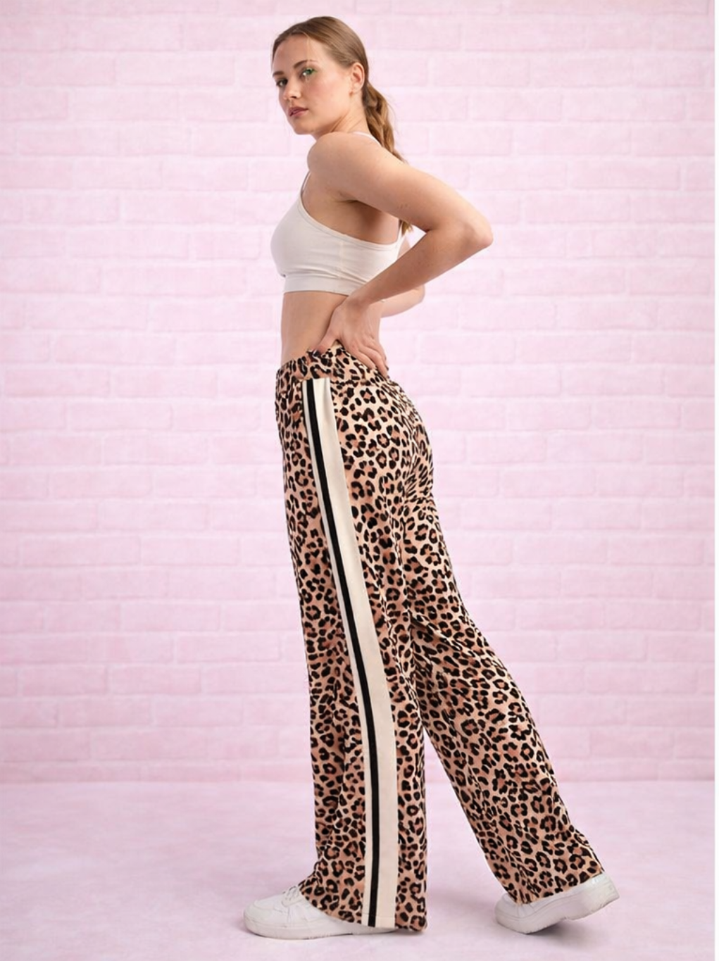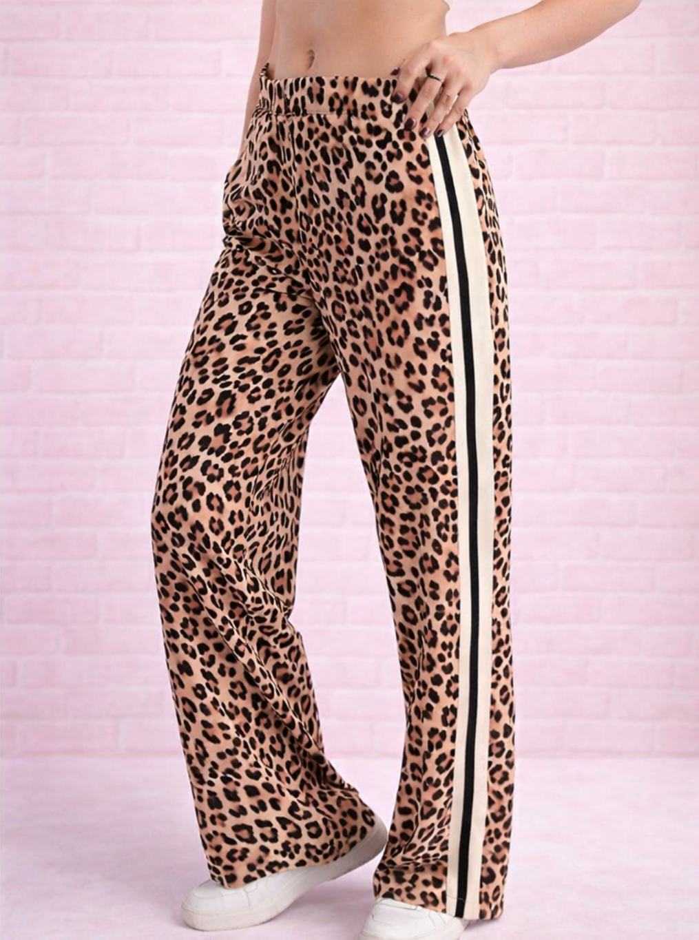 Straight-leg pant made from animal printed butter soft fabric with 4-way stretch, featuring side stripe details for a sporty-chic look — perfect for both active and casual wear.